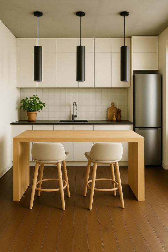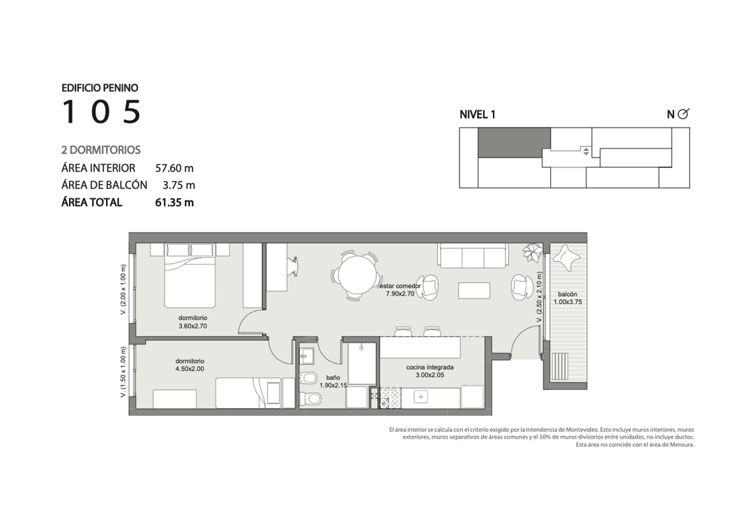 Living comedor con terraza, cocina integrada con barra separadora, dos dormitorios y un baño completo.