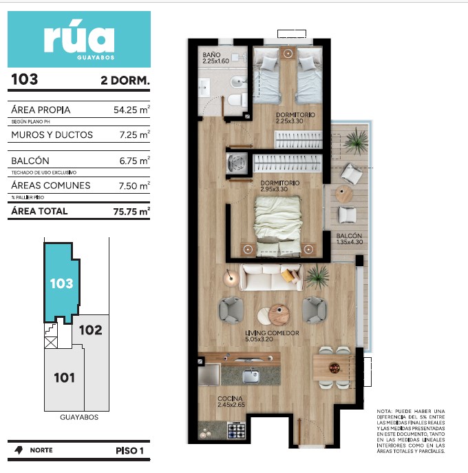 Primer piso al contrafrente con orientación Norte. Living comedor con cocina semi integrada mediante barra. Cómodo balcón con salida desde el living y dormitorio principal.