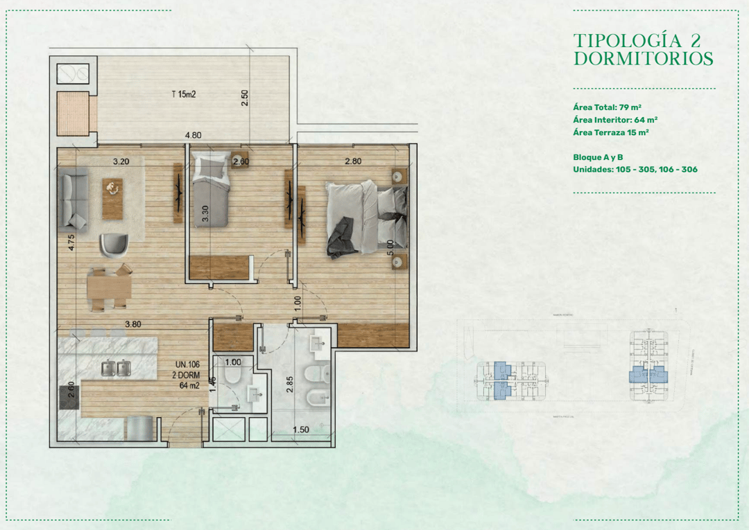 MANSA FOREST: Este departamento de dos dormitorios logra un balance ideal entre amplitud y funcionalidad. El corazón del hogar es un living comedor luminoso con cocina integrada, que se conecta directamente con la terraza de 15 m²: un espacio pensado para compartir, relajarse o disfrutar del aire libre sin salir de casa.