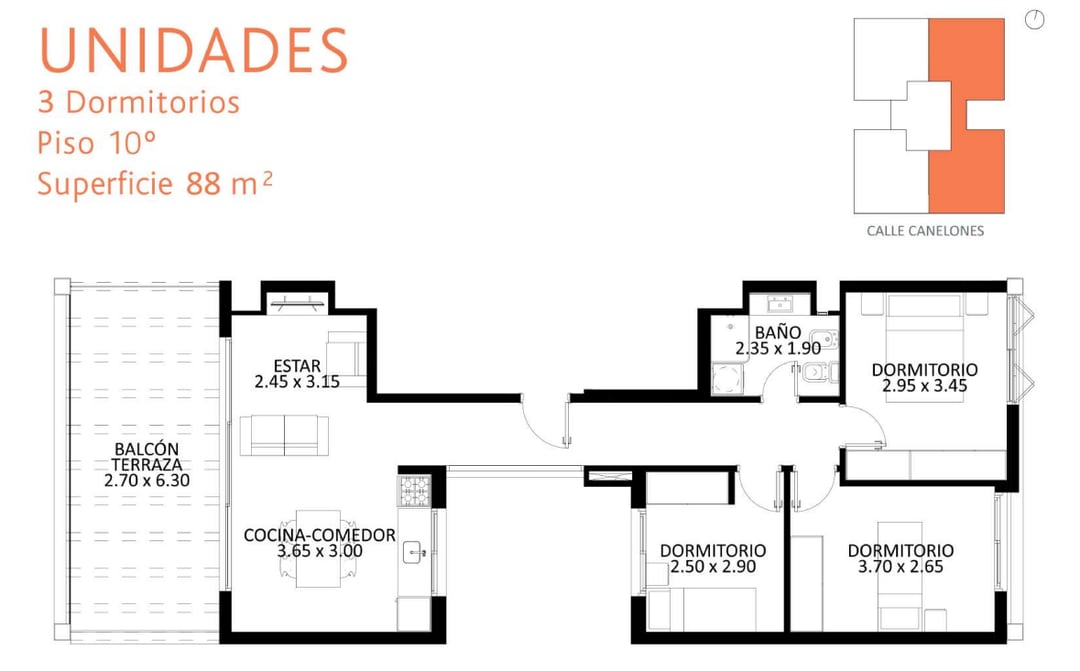 ¡Cómoda y luminosa planta! Piso 10° al frente con orientación Oeste, living comedor con salida a gran terraza, cocina integrada al mismo. Tres amplios y luminosos dormitorios. Baño completo.
