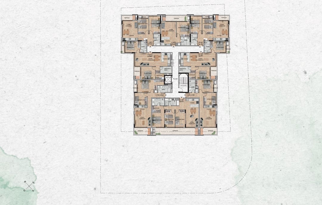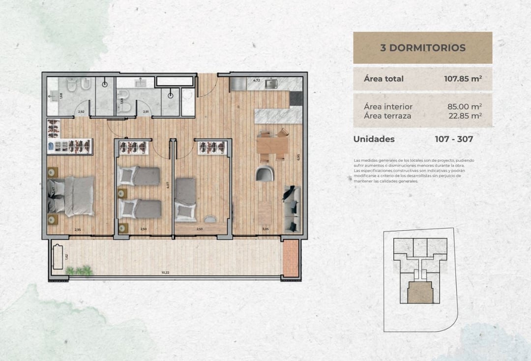 Unidad de 3 dormitorios en primer piso al frente, con orientación Suroeste. Cuenta con living comedor, cocina integrada, dos baños completos y amplia terraza.