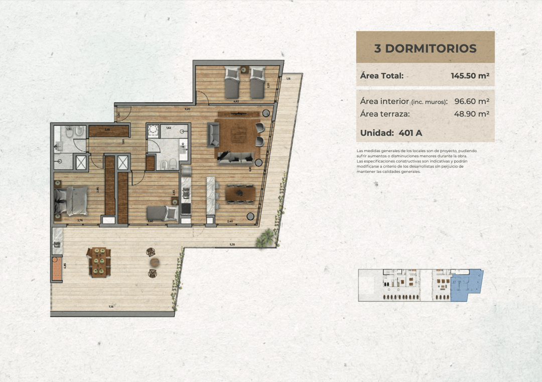 Apartamento de 3 dormitorios al frente.