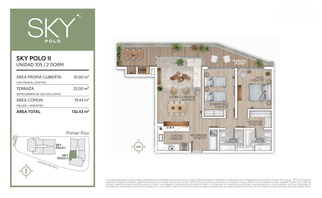 Apartamento en venta de dos dormitorios en SKY POLO ubicado frente a Carrasco Polo Club y al barrio privado Los Olivos, en la proa entre Av. del Polo y Cno. Gigantes.