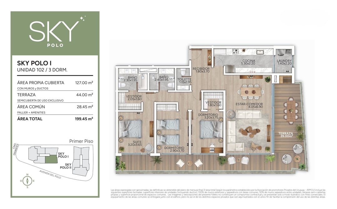 Apartamento en venta de tres dormitorios en SKY POLO ubicado frente a Carrasco Polo Club y al barrio privado Los Olivos, en la proa entre Av. del Polo y Cno. Gigantes.
