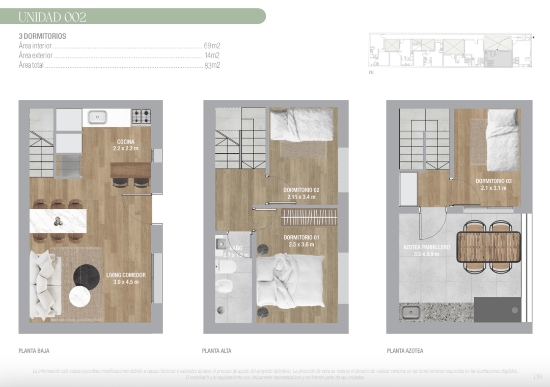 Unidad tríplex de 3 dormitorios, con ventilación e iluminación natural.