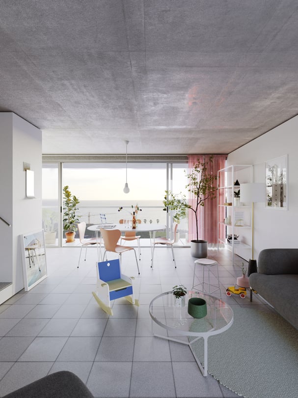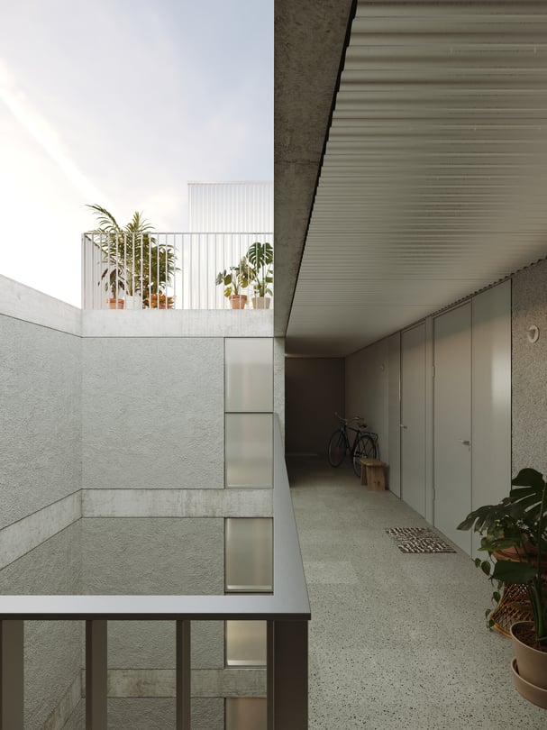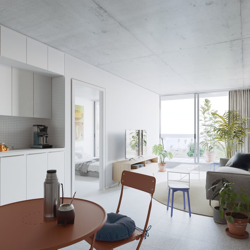 El edificio realiza un giro de 90 grados orientando su fachada principal hacia el Rio de la Plata sin desatender la continuidad con el entorno urbano inmediato. A través de un sistema circulatorio de pasarelas que ventilan a un patio interior se organizan 39 unidades.