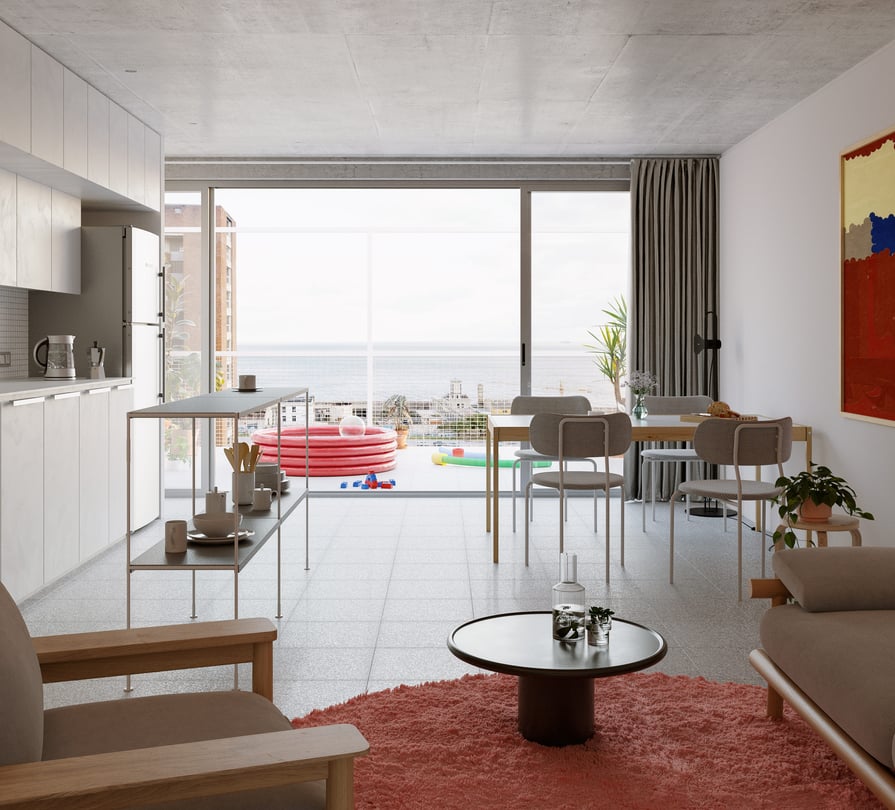 Living comedor con salida a gran terraza. Cocina integrada con baño social. Espacio de escritorio o posible 4to dormitorio.