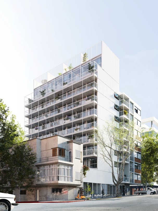 El edificio realiza un giro de 90 grados orientando su fachada principal hacia el Rio de la Plata sin desatender la continuidad con el entorno urbano inmediato. A través de un sistema circulatorio de pasarelas que ventilan a un patio interior se organizan 39 unidades.