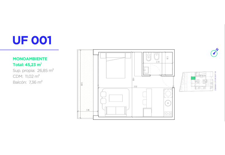 La unidad se encuentra en planta baja, al contrafrente. Cuenta con una superficie total de 45,23 m², y presenta un diseño funcional que optimiza el espacio disponible.