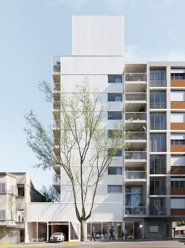 El edificio realiza un giro de 90 grados orientando su fachada principal hacia el Rio de la Plata sin desatender la continuidad con el entorno urbano inmediato. A través de un sistema circulatorio de pasarelas que ventilan a un patio interior se organizan 39 unidades.