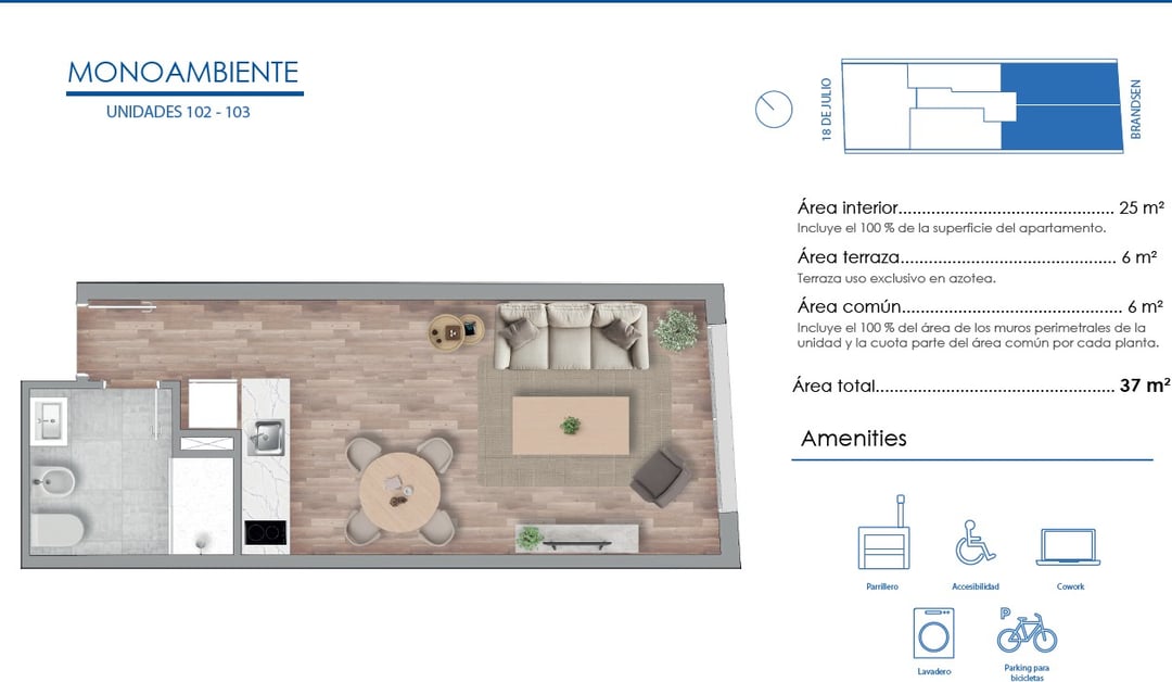 Además de tu apartamento, vas a disfrutar de una gama de comodidades diseñadas para tu bienestar. Relajate en el sky bar, mantenete en forma en el gimnasio o trabajá cómodamente en el espacio de cowork. Para tu conveniencia, también hay un lavadero y un parking para bicicletas.