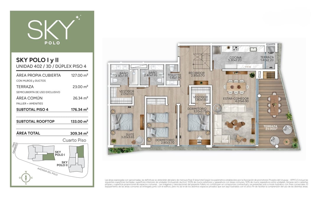 La unidad está ubicada en el cuarto piso de Torre I con orientación Este de 309mt2 en total cuenta con cocina definida con anafe a gas, horno y campana instalados, estar comedor, tres dormitorios: el principal en suite con vestidor, toilette y amplio balcón. En el rooftop contará con parrillero, laundry y baño social.