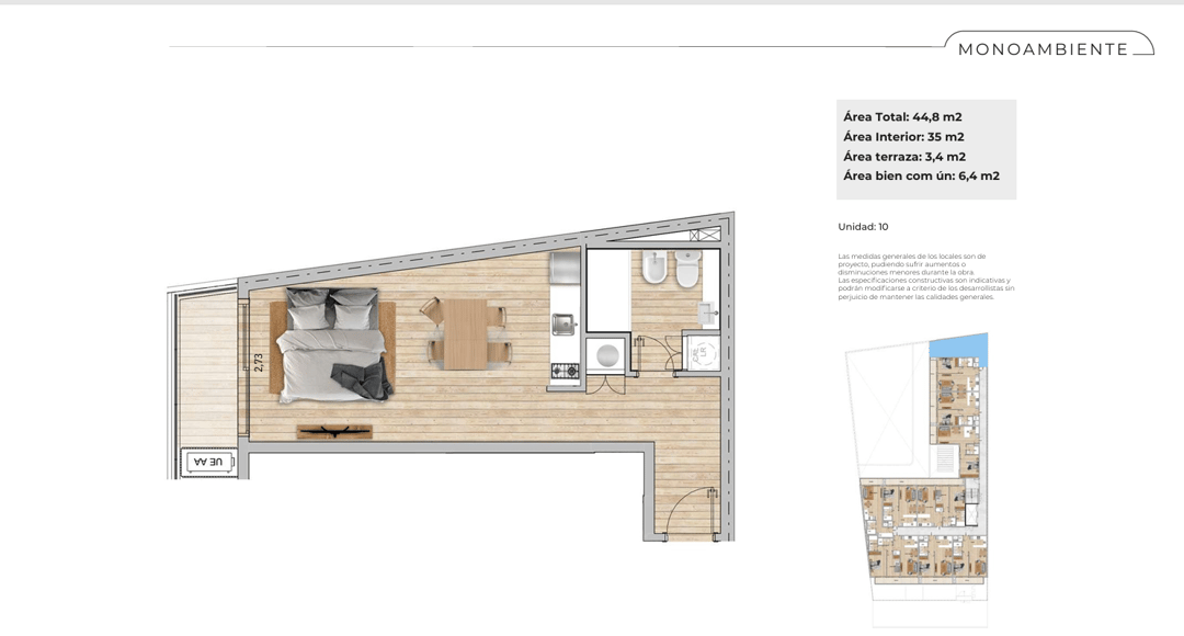 La unidad es un monoambiente de 35 m² interiores y terraza de 3,4 m², distribuidos para maximizar cada rincón. El diseño aprovecha al máximo la luz natural y ofrece una sensación de amplitud poco común. La unidad cuenta con un funcional espacio de cocina y una barra comedor que divide sutilmente el ambiente.