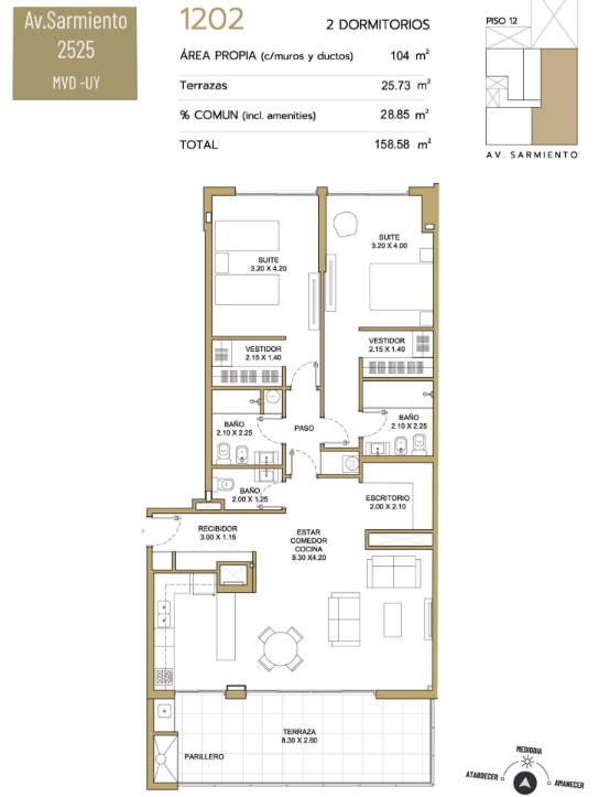 La unidad se encuentra en impecable estado y ofrece una planta con características únicas. Cuenta con amplio living comedor con salida a gran terraza con parrillero al frente con vistas despejadas. Cocina definida con office. Espacio adicional pensado para escritorio o rincón de trabajo. Dispone de dos cómodas suites, ambas con vestidores y baños completos. Además, cuenta con toilette y un recibidor con placard de gran capacidad.