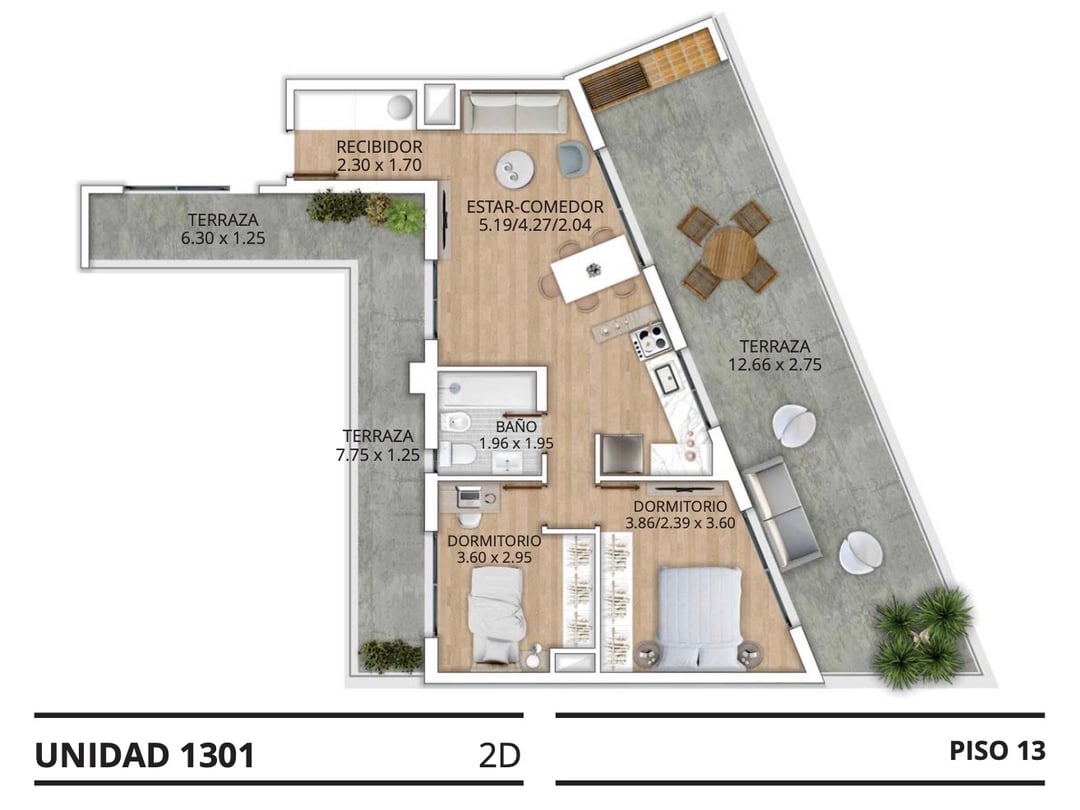 Cuenta con 2 dormitorios, 1 baño completo y un amplio living-comedor integrado a la cocina. Destacan sus dos terrazas privadas que suman 52 m², ideales para disfrutar del aire libre, con parrillero propio para reuniones y asados con familia o amigos.
