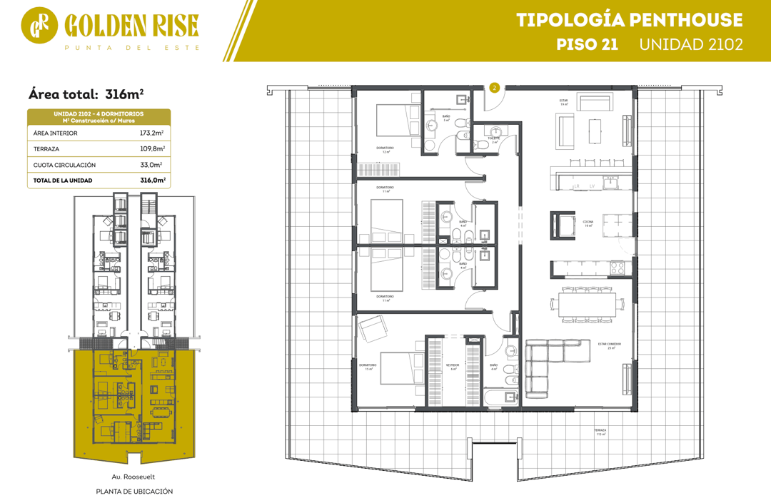 Venta de Penthouse de 4 dormitorios en Golden Rise, proyecto residencial de vanguardia desarrollado por Grupo Caybo Uruguay, ubicado en la prestigiosa Av. Roosevelt y Salt Lake, en el corazón de Punta del Este, uno de los destinos más atractivos y seguros de Latinoamérica para invertir.