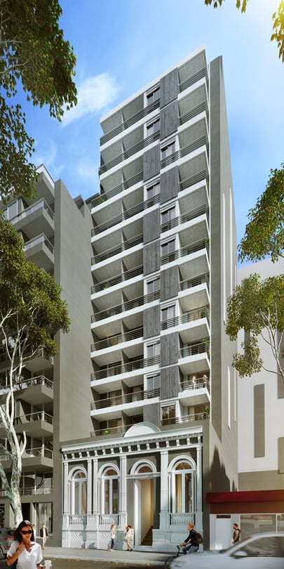 Se basa en el juego de contrastes entre lo antiguo y lo moderno, está compuesto por dos edificios de 13 pisos cada uno con entradas y hall independientes, uno por la calle Canelones y otro por la calle Lorenzo Carnelli, pero conectados por la Planta Baja y Subsuelo.