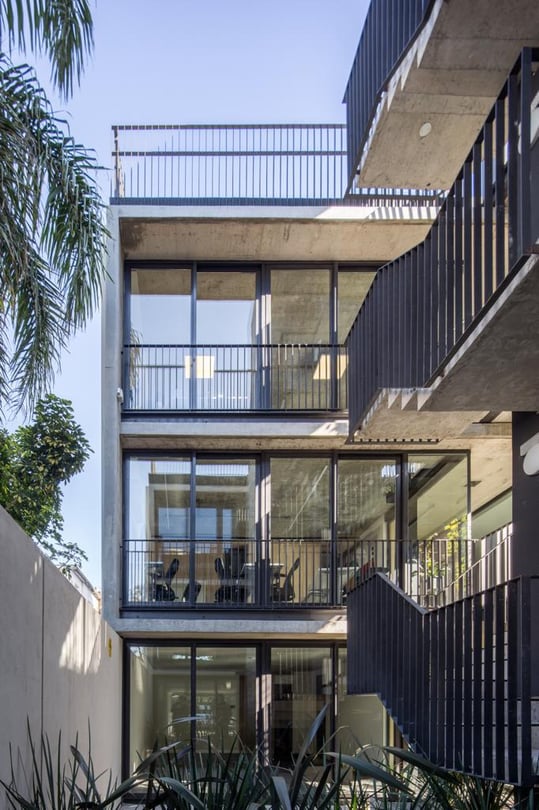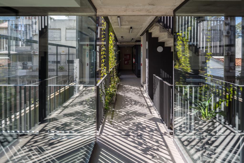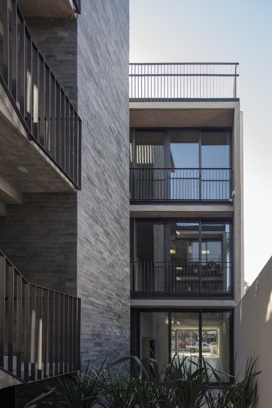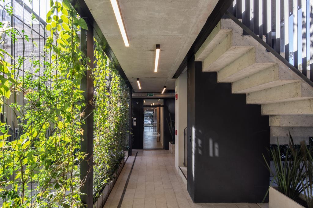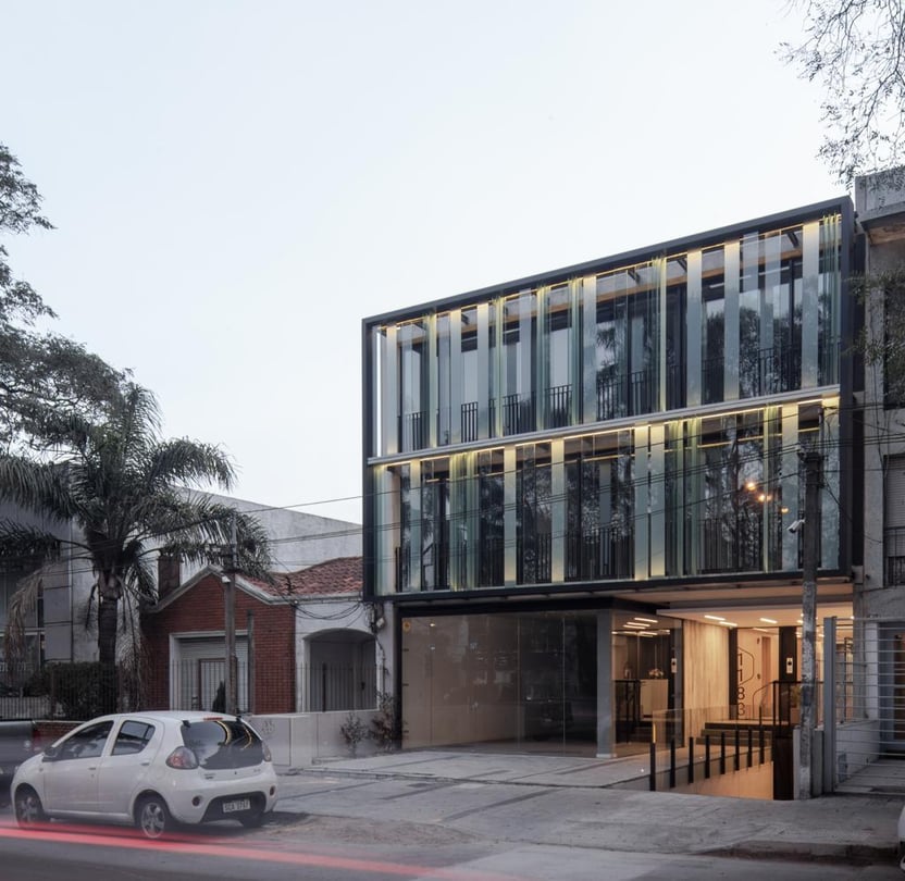 Un espacio arquitectónico moderno y funcional, proyectado en un edificio de pequeña escala que combina oficinas, lobby con control de acceso, monitoreo de seguridad, servicio de recepción y una fachada 100% vidriada que permite una excelente luminosidad e integración con el entorno.