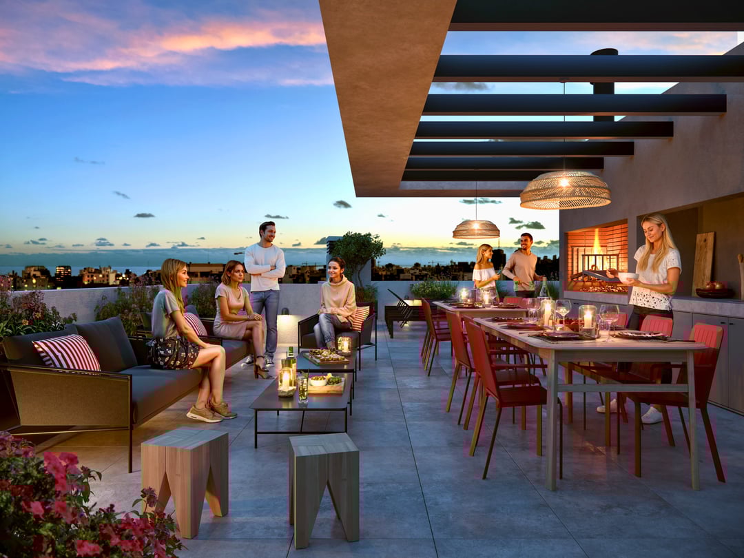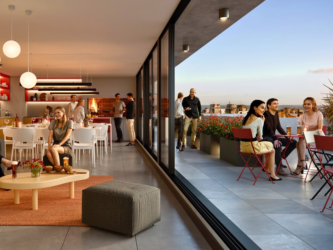 En el último piso, se encuentra una terraza con una vista panorámica del skyline de la ciudad. Este espacio alberga los siguientes amenities: