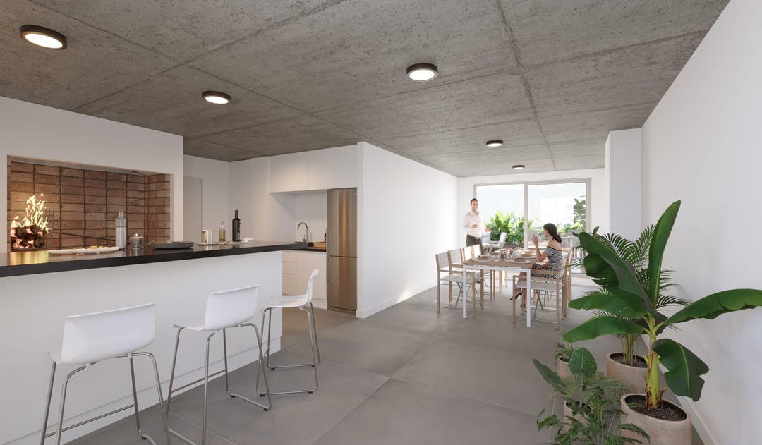 Amenities: Terraza abierta al oeste, salón cerrado con parrillero y equipamiento de uso común, kitchenette, servicio, depósito independiente y lavadero.