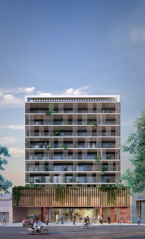 Proyectado en 10 pisos, con 10 apartamentos por piso. Todos cuentan con terrazas.