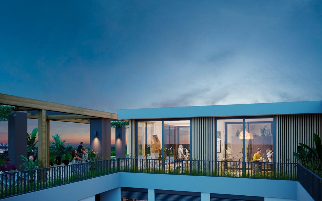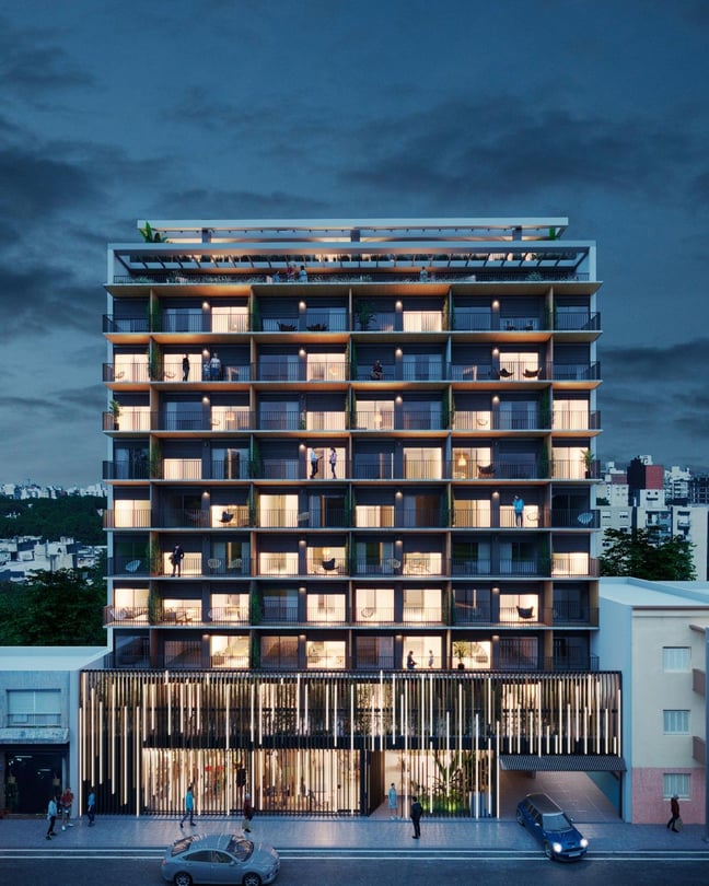 Proyectado en 11 pisos, con 14 apartamentos por piso. Todos cuentan con terrazas.